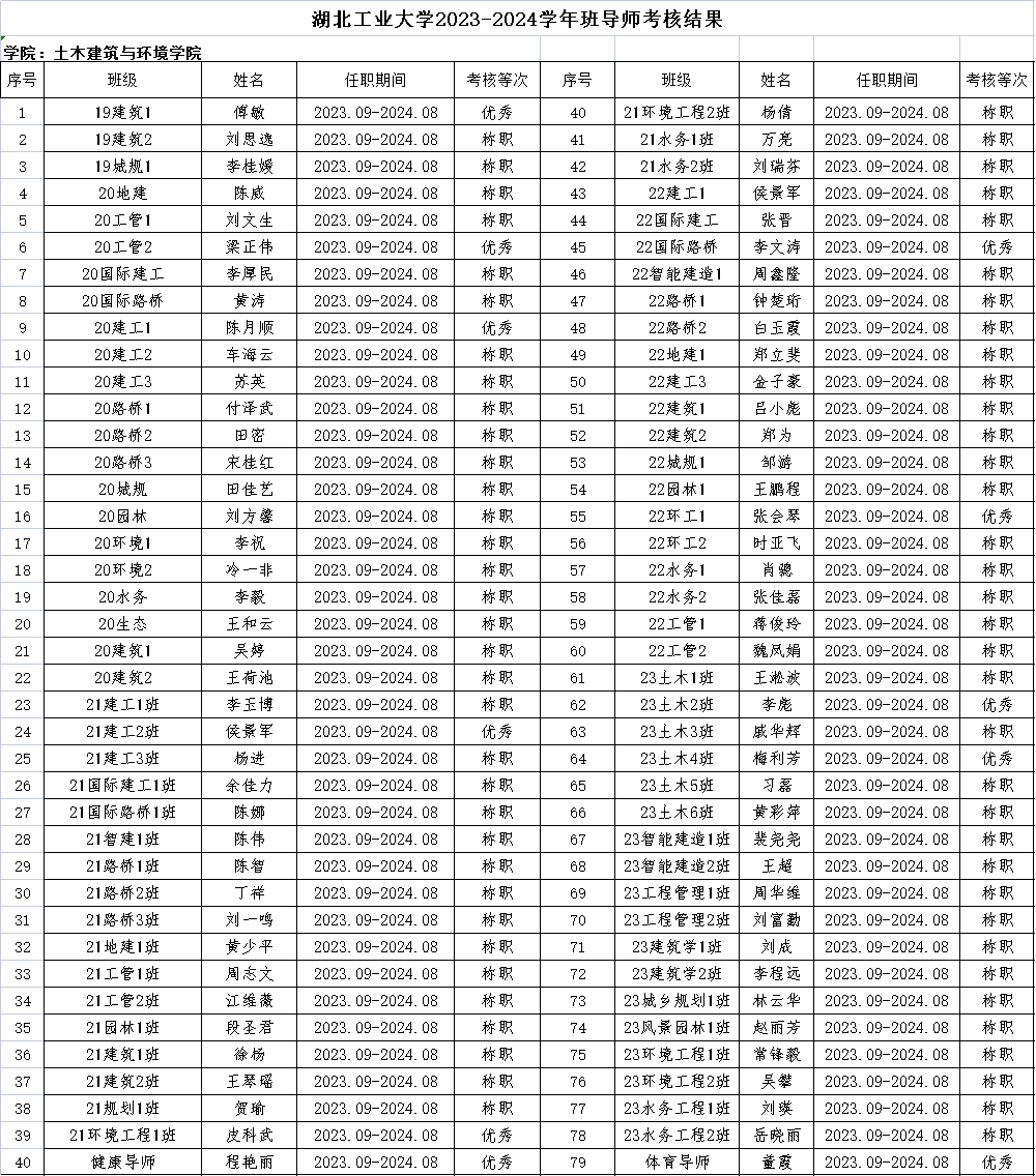 根据《关于2023-2024学年班导师工作考核的通知》文件精神及各类别评选指标,在班导师个人申请的基础上、经学生工作办公室评议、学院考核,拟推荐梁正伟等9人为校级优秀班导师、王和云等10人为院级优秀班导师。名单如下: