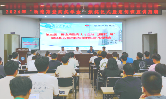 5月28日上午,土木建筑与环境学院举行2024年“杨连第登高奖学金”颁发仪式暨定制班宣讲招聘会。中铁十一局集团公司及所属城轨公司相关领导应邀出席,仪式由学院党委副书记周利涛主持。