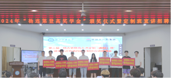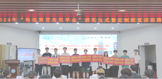 中铁十一局连续3年在学院设立“杨连第登高奖学金”,以激励杨连第登高人才定制班学员和在校优秀学生。城轨公司总经理助理、人力资源部部长陈正超和中铁十一局集团公司人力资源部招聘科长胡光云为王智广、魏子旋、毕拉力等17名定制班学员颁发了奖学金。