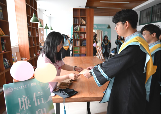 “廉信小印”区,辅导员将漫游四年的信件送到同学们手中。这些信件承载着同学们四年的成长记忆,见证了他们从青涩学子蜕变为有志青年。工作人员分发了学院特别定制的专属纪念章,希望毕业生在未来人生道路上,能够不忘初心、廉洁自律,成为社会的栋梁之才。