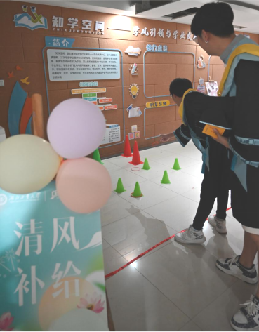 “清风补给”区,“廉在心,不偏离”丢飞镖和“树底线,心向廉”套圈小游戏,吸引了众多同学的目光。他们围成一圈,脸上洋溢着兴奋和期待,跃跃欲试。