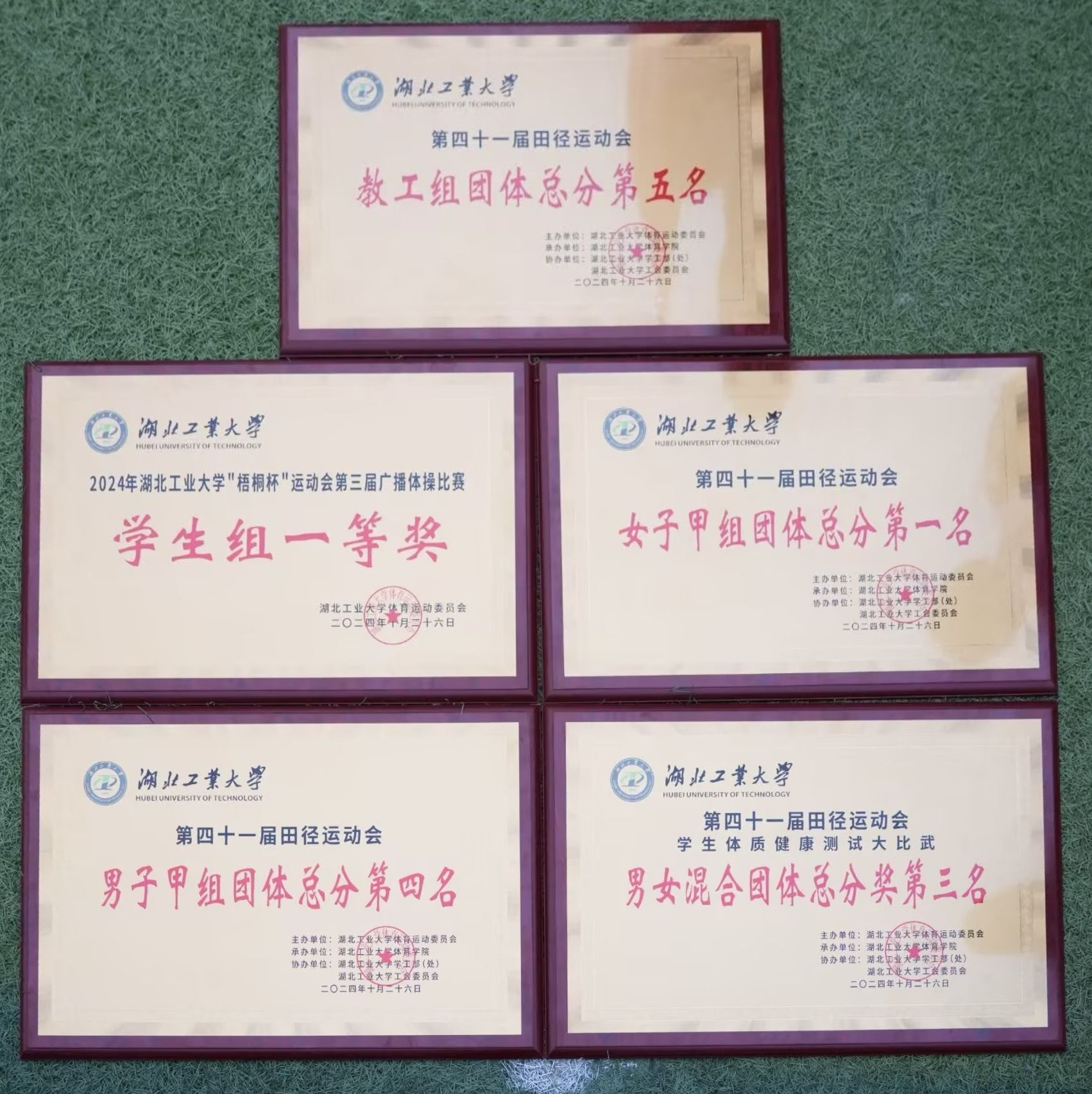 2024年10月25日26日湖北工业大学举行了第四十一届运动会。随着最后一项比赛的圆满落幕,本次运动会也画上了完美的句号。我院运动健儿们在赛场上奋力拼搏,展现出了非凡的实力和顽强的拼搏精神,最终共获得女子甲组团体总分第一名,广播体操学生组一等奖,男女混合团体总分奖第三名,男子甲组团体总分第四名,教工组团体总分第五名等五块团体奖牌,为学院赢得了荣誉。