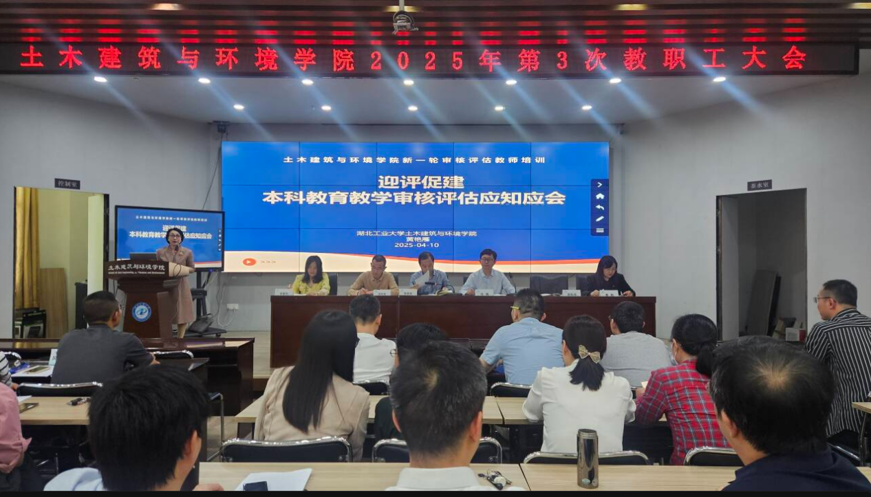 为迎接下半年的本科教育教学审核评估工作,进一步提升教育教学质量,4月10日下午,学院在土建楼三楼报告厅召开全体教职工大会,开展本科教育教学审核评估应知应会培训。