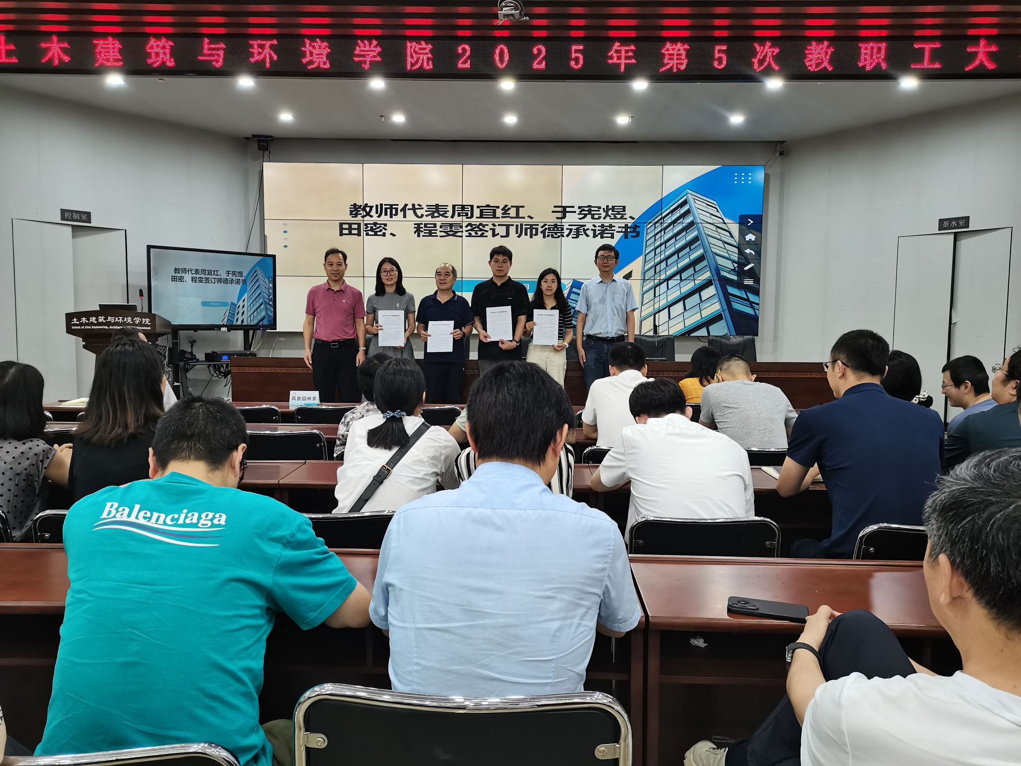 大会现场,四名教师代表庄重签署了《湖北工业大学2025年师德师风承诺书》。程雯老师带领全体教职工重温《新时代高校教师职业行为十项准则》,进一步强化了教师的职业行为规范意识和责任担当。
