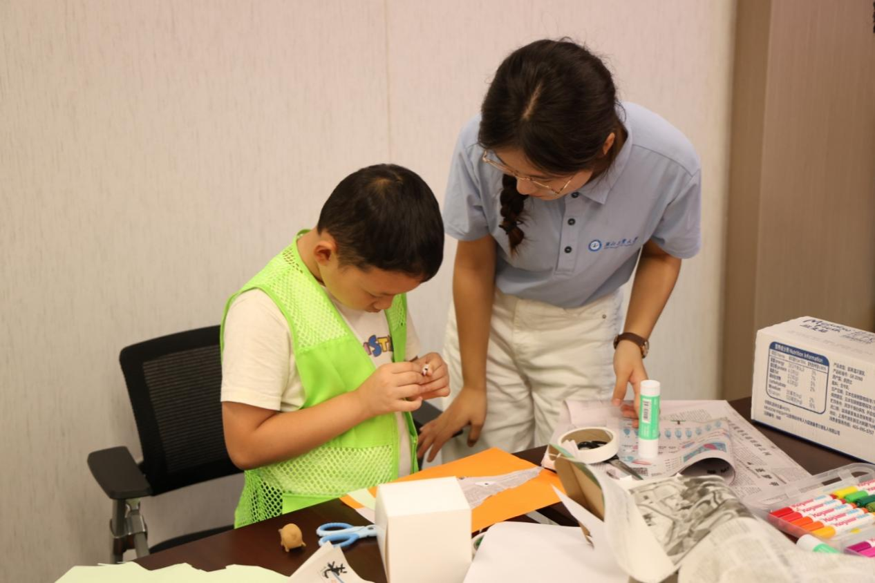 活动现场,土木建筑与环境学院“筑梦”青年志愿者协会的代表为暑期托管班的孩子和家长们上最后一堂“旧物改造”亲子手工活动课。大家发挥巧思,在动手实践中深刻体会“变废为宝”的低碳智慧。