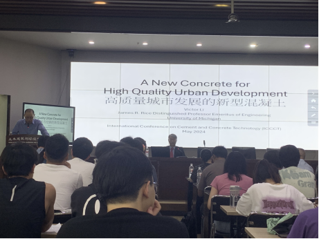 2024年5月18日下午,美国密西根大学土木工程系Vicotor C Li教授在湖北工业大学土木建筑与环境学院三楼报告厅为我院师生做了题为“用于可持续基础设施的混凝土A New Concrete for Sustaintable Infrastructure”的精彩学术报告。随后进行了Engineered Cementitous Composites系列研究-学术报告会,武汉大学蔡新华教授、华中科技大学陈娥副教授、长江水利委员会长江科学院石妍、湖北工业大学谭燕教授、香港科技大学王天宇博士、中山大学伍浩良副教授、 重庆大学张志刚副教授、同济大学余江滔教授等先后进行了有关ECC最新研究进展的精彩简短报告;华中科技大学张耀庭教授和陈旭副教授应邀参会。本次讲座由同济大学余江滔教授主持。