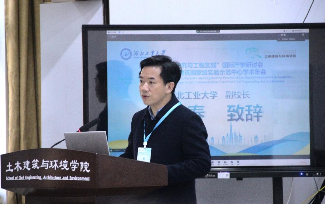 湖北工业大学党委常委、副校长宋小春教授致大会开幕辞,他介绍了学校办学理念、学科特色,土木建筑与环境学院智能建造专业发展等情况,对各位专家莅临会议表示了热烈欢迎,对长期以来关心、支持和帮助湖北工业大学的专家们表示了诚挚感谢,向“智能建造研究与工程实践”国际产学研讨会暨土木工程与建筑国家级实验示范中心学术年会的隆重召开表示了衷心祝贺!